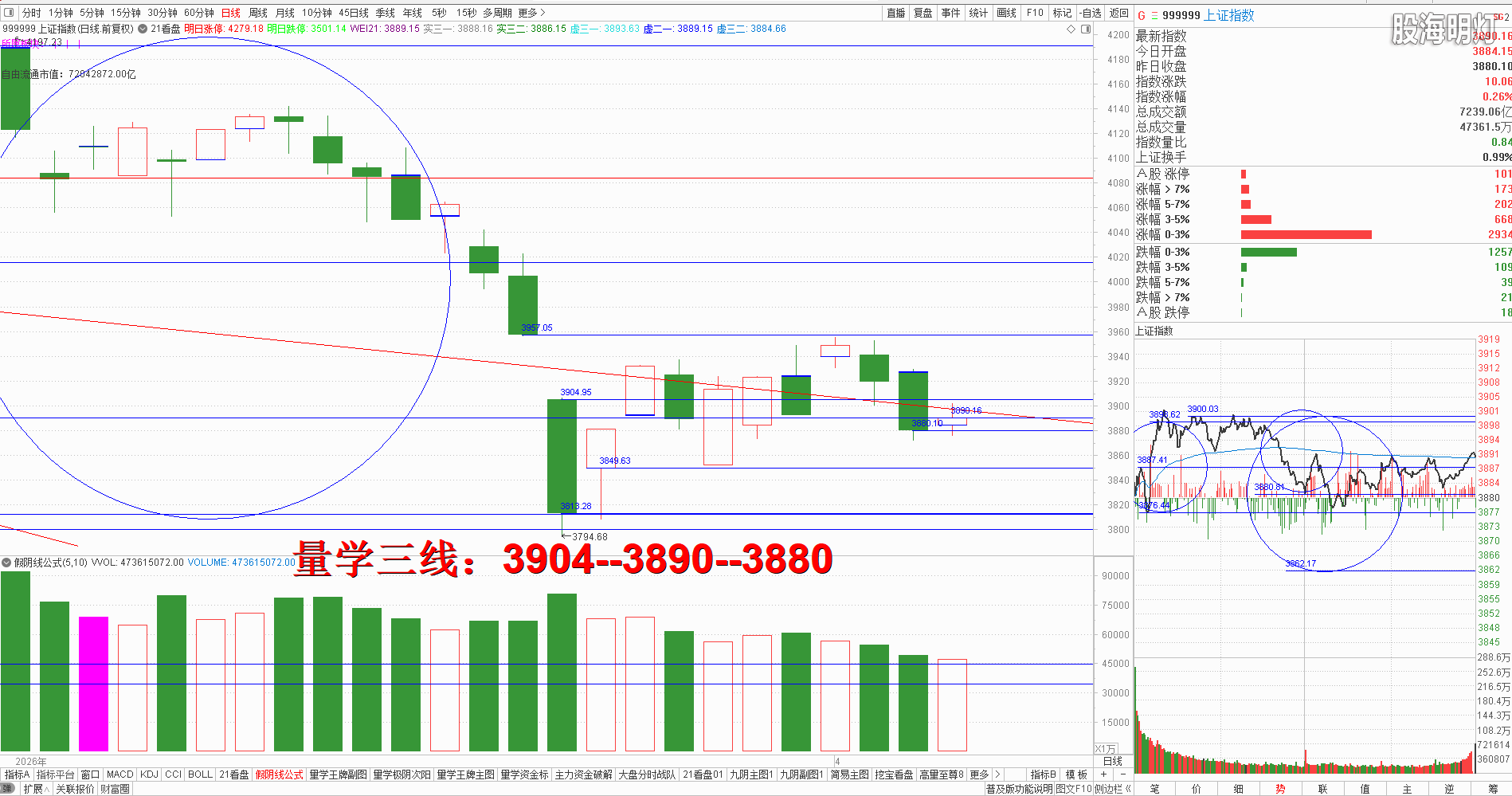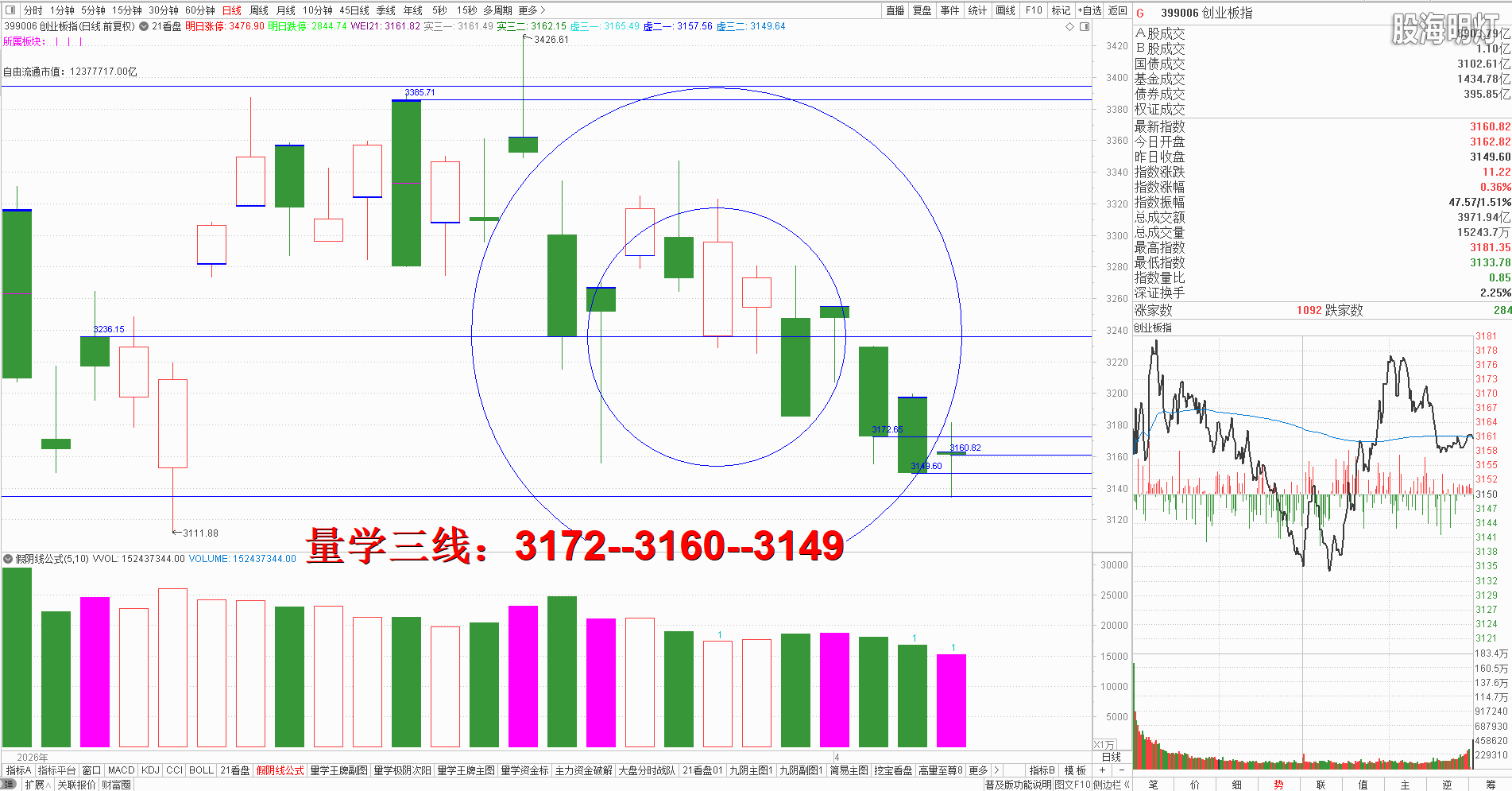 友情提示:股市有风险,入市需谨慎!本文是纯专业量学知识点分享,所有术语均出自量学五本专业教材,本文分析仅代表作者个人观点,我们采用清华大学出版社、经济日报出版社和四川人民出版社《量学经典教材》,旨在记录和验证量学盘前预报,总结提升量学经验,积累历史档案,不为操盘指导,据此实盘者盈亏自负,均与作者无关!好的谷票管一阵子,好的技术管一辈子,学习改变人生,学习改变未来!我们不但教给大家量学技术,更为大家提供适合自己的量学方案,让我们快来一起学习吧! 一、 昨日研判:周一常态应该继续惯性下跌,结合开盘定势,一旦周一竞价跳空阴低开,不能有效返回今日阴半上方站稳,就会继续下探下方金线3849点,一旦3849点金线继续跌破则左侧所有王牌全军覆灭,后果很严重,所以只要下周而开盘不能出现有效次阳,稳健者必须严格模拟执行量学不见有效次阳不动心知识点,今日没有按标准模拟防护的,周二跳空阴开盘也必须继续执行逢高防护,一切必须以保护好自己为主,然后再观察后势为佳。量学【上日三线】:3884--3880--3849.早盘竞价小幅高开,但是不能有效站稳节前阴线二一位上方就还属于量学假阳真阴知识点,那么只要早盘量波不健康的急拉冲高应该先模拟训练逢高替领防控,开盘后受风向标券券快速冲高的影响大盘跟随小幅冲高,其后券券跳水大盘跟随跳水,券券形成分时平底后再次快速急拉,大盘跟随恐龙波高速急拉,但是明显量价不跟,其后形成峰顶下降且形成分时平顶不过,这时就是最佳的择机逢高替领的机会,其后券券跳水带动大盘跟随,尾盘勉强返回人线但收盘量波勾头向下,收盘假阳真阴十字星单枪,对应量柱微缩量,明日将进入变盘窗口期,量学箴言:假阳真阴,务必当心!所以明日还需有效真阳站上3904点上方,达标方可模拟接回今日替领部分,结合开盘定势,明日强势应该竞价高开且量波正三维有效站稳3904点上方;反之低开不能有效站上3904点上方,一旦有效跌破3880点阴实底就需谨防中大阴向下加速出现,所以稳健者当下必须严格执行不见有效次阳不动心知识点。明日量学【上日三线】:3904--3890--3880.  二、创业板研判:今天竞价高开后受大盘影响盘中剧烈震荡,收盘假阴真阳长腿十字星,对应量柱百日低量柱,明日结合三线空间上小下大看跌防涨。量学三段以上高手可继续模拟训练“不理指数,精练个谷”;涨停趋势依然是量学“极阴次阳回马枪战法+凹里淘金战法”为主,今日收盘6只20CM,可见今日人品低迷且模拟训练难度明显增大,模拟训练难度非常考验量学功底;后势涨停趋势可继续模拟学习量学凹底淘金知识点+极阴次阳回马枪+康桥战法模拟训练,要特别训练出现首跌缩量,精准回踩重要量线出现有效次阳后出现量学刹车王牌柱知识点后,看不懂量学建构,不明白量学量波技术原理,切忌盘中盲目追涨杀跌,看不懂就不要强求。模拟训练一定要训练在自己认知之内的案例,看不懂的案例还需做到:宁错过,不做错。一般人最好耐心模拟学习量学不见次阳不动心知识点。 周二量学【创业板三线】:3172--3160--3149。 三、板块解析:行业板块【化工33板第一;建筑7板第二;电气设备,文教休闲,医药,化纤各5板第三】;概念板块【储能20板第一;新材料,光伏各16板第二;锂电池15板第三;芯片12板第四;乡村振兴,新能源车,人工智能,节能环保各11板第五】。今天新能源类热点,新内需类与新科技类辅助;后势继续跟踪主线板块新科技与新能源类轮动,主线类板块 跟踪学习能否再次构建刹车王牌柱且量性转强,在没有出现王牌柱之前还不适合盲目盘中追涨; 风向标证券,早盘小幅高开后开盘剧烈震荡,并影响大盘跟随,其后人线跌落人线下方,震荡一小时后开启跳水并影响大盘跟随跳水,下午形成分时平底后震荡反弹,并带领大盘跟随反弹,风向标身份淋漓尽致,收盘小心十字星,对应量柱比节前百低低量柱更低,明日结合开盘定势一旦竞价低开且跌破最近支撑1460点,就需谨防向下放量中大阴加速,反之一旦出现有效真阳确认今日百低有效就会引领大盘出现真阳。 四、涨停趋势:跳空阳战法+极阴次阳战法+凹里淘金战法+回马枪战法+三低三有战法,学习可参照量学五大天经教材《伏击涨停》,《涨停密码》相关章节内容学习。